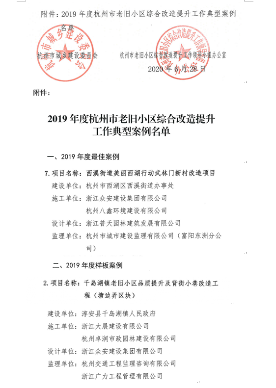 經(jīng)過(guò)專家評(píng)審,我集團(tuán)——西溪街道美麗西湖行動(dòng)武林門新村改造項(xiàng)目、千島湖鎮(zhèn)老舊小區(qū)品質(zhì)提升及背街小巷改造項(xiàng)目被評(píng)為2019年度老舊小區(qū)綜合改造提升工作典型案例,予以通報(bào)表?yè)P(yáng)。